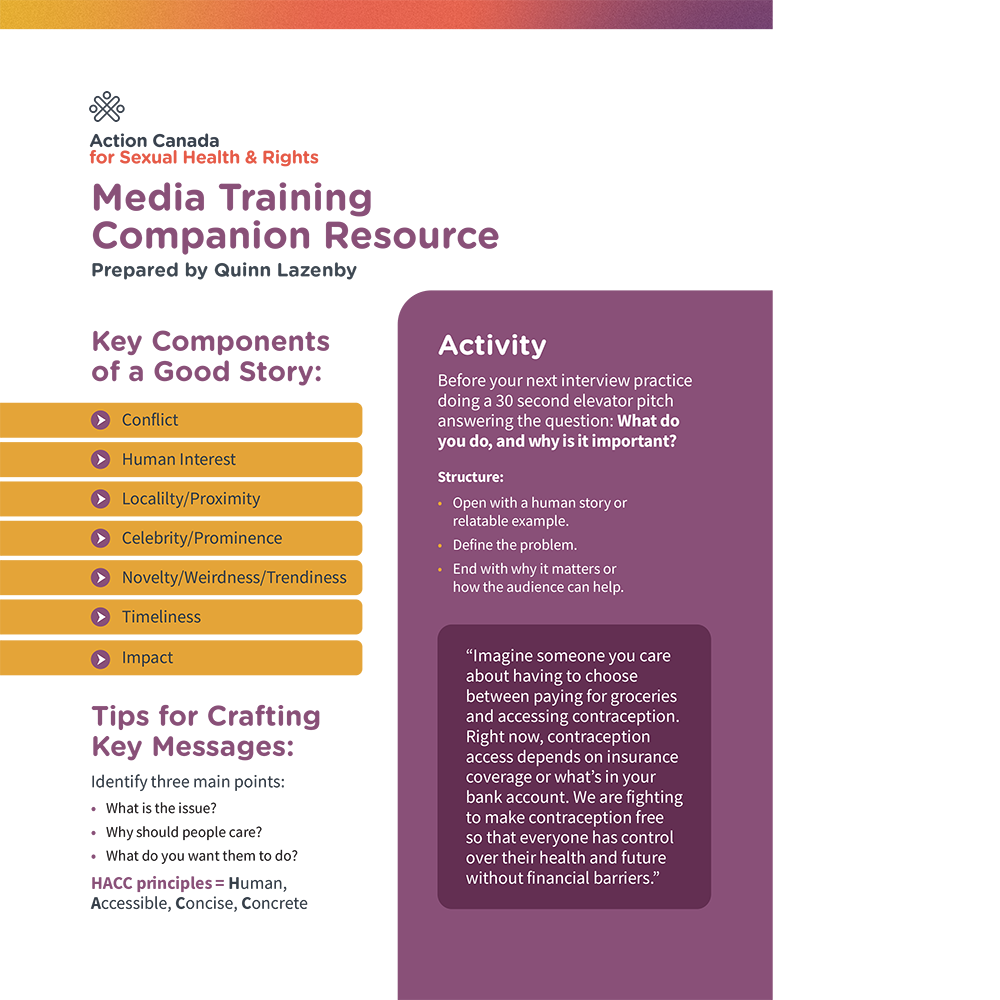 This companion resource shares best practices to sharpen your key message and interview skills. It is intended to support Action Canada's media training workshop. For interest in the workshop, please email quinn@actioncanadashr.org
