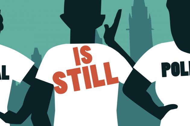 3 figures with their backs toward the image with hands on hips facing parliament buildings with The Personal is Still Political written on their backs.